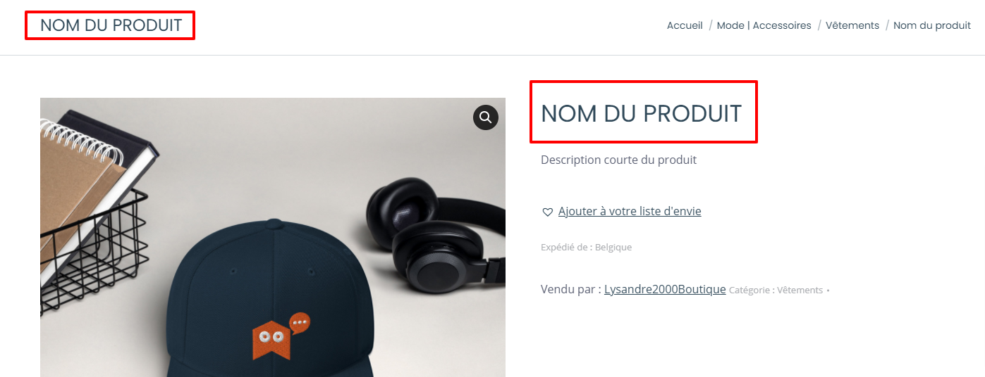 Le nom de votre produit sera affiché dans les encadrés en rouge.